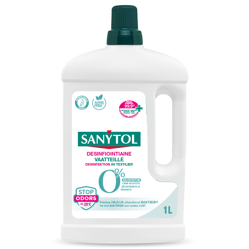 Sanytol on kehittänyt 0 %:n hajusteettoman, väriaineettoman ja säilöntäaineettoman vaatteiden desinfiointiaineen, joka takaa hygienisesti puhtaat vaatteet ilman epämiellyttäviä hajuja. Sen TRIPLE ACTION -toiminto poistaa 99,9 % bakteereista, Candida albicans -hiivasta ja viruksista, kuten ihmiselle vaarallisista 229E-koronaviruksesta ja H1N1-viruksesta. Lisäksi sen ainutlaatuinen STOP ODORS -teknologia: